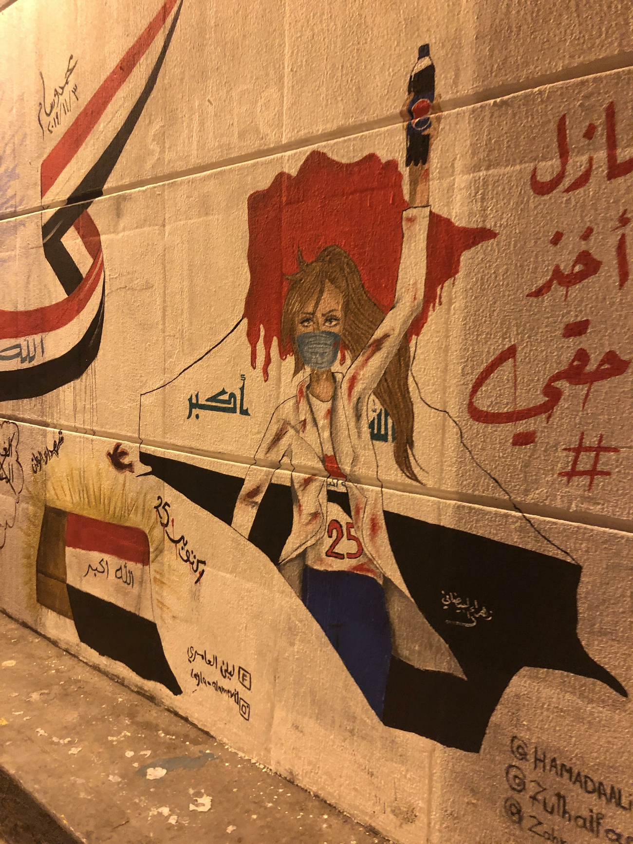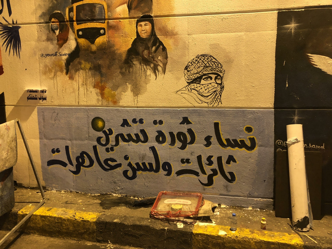"شماغچ (كوفيتك) والحُمرة، محلیات (يُجَملنَّ) الثورة". تُطالعنا هذه العبارة مكتوبة بخط كبير على حافة نفق ساحة التحرير في بغداد والذي تحوّل إلى معرض فنيّ من جداريات تخاطب بشكل أو بآخر صورة المرأة، سواء كانت تقليدية مثل أم الشهيد أو الحبيبة، أو متظاهرة مثل الطالبة أو الطبيبة أو الناشطة. "نساء ثورة تشرين ثائرات ولسن عاهرات". نقرأ جدارية أخرى، کردٍ على ما روّجته قنوات الإعلام الموالية للأحزاب الحاكمة من تشهير استهدف النساء المشاركات في الثورة. الكثير من الشبان المتظاهرين كبروا في أُسَرٍ تقودها النساء. فالحروب المستمرة والاغتيالات والخطف الذي مارسته الأنظمة المتعاقبة على العراق خلّفت الكثير من الأُسر الأحادية، التي عادة ما تكون فيها الأم هي المربي والمُعيل الوحيد. لذلك تلعب المرأة، خاصة الأم، دورًا مركزيًا في حياة معظم هؤلاء الشبان، وشكّلت الرمز الأهم للثورة. فحتى أيقونة ثورة أكتوبر الشاب الثائر صفاء السراي، والذي اغتيل في بداية الثورة بقنبلة غاز في الرأس، كان قد أطلق على نفسه اسم "ابن ثَنْوة" تيمنًا بأمّه "ثنوة" التي رحلت وهي تصارع مرض السرطان، ليصبح يتيمًا متطلعًا للُقياها. وأصبح اسم "ابن ثنوة" رمزًا لكل الثوار. لذلك عندما توجّه وفد من الأمهات إلى ساتر جسر السنك في بغداد لمنع بعضهم من الاحتكاك بعناصر الشغب المرابطة هناك خوفًا على حياة المتظاهرين ومحافظةً على سلمية التظاهرات، كانت استجابة الشبان للأمهات كاملة.
