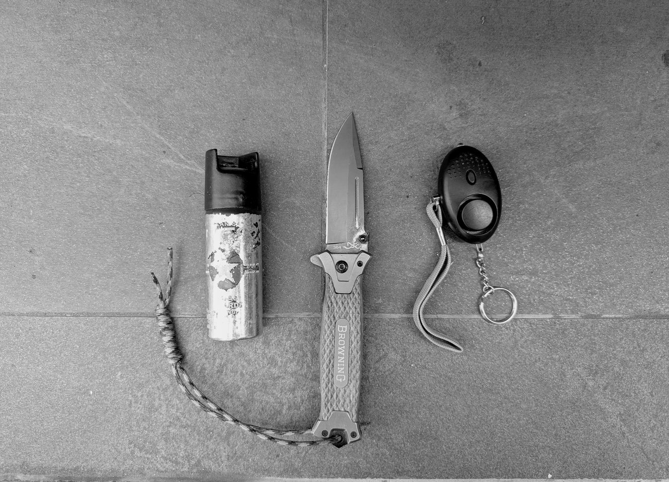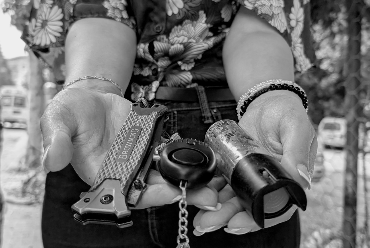 منذ ذلك الوقت وحقيبتُها لا تخلو من بخاخ الفلفل وسكين صغيرة وجهاز إنذار. تضحك وهي تخبرنا كيف جلبت لها صديقتها من تركيا سكينًا كهديّة، بعدما اشتهرت بين معارفها بحمل هذه الأدوات. "أحملها للأن وجودها يمنحني شيئًا من الاطمئنان… فهي وسيلة للدفاع عن نفسي إذا اضطرني الأمر".