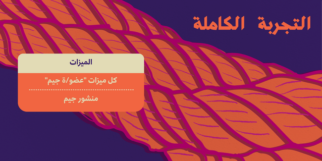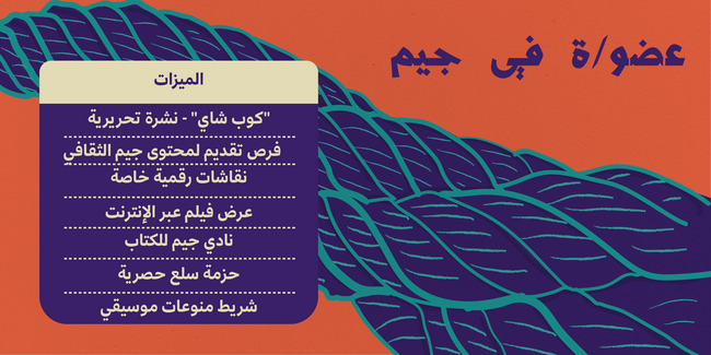ستحصل/ين على: القدرة على أن تصبح/ي جزءًا من دائرتنا الضيّقة. والعضوية تشتمل على نشرتنا الفصلية الحصرية بعنوان "كوب شاي"، ودعوات لنقاشات حصرية عبر الإنترنت ولقاءات متخصّصة (ماستر كلاس) ومزيجٍ موسيقيّ وعروض أفلام عن بُعد بالإضافة إلى منتجات جيم الحصرية.